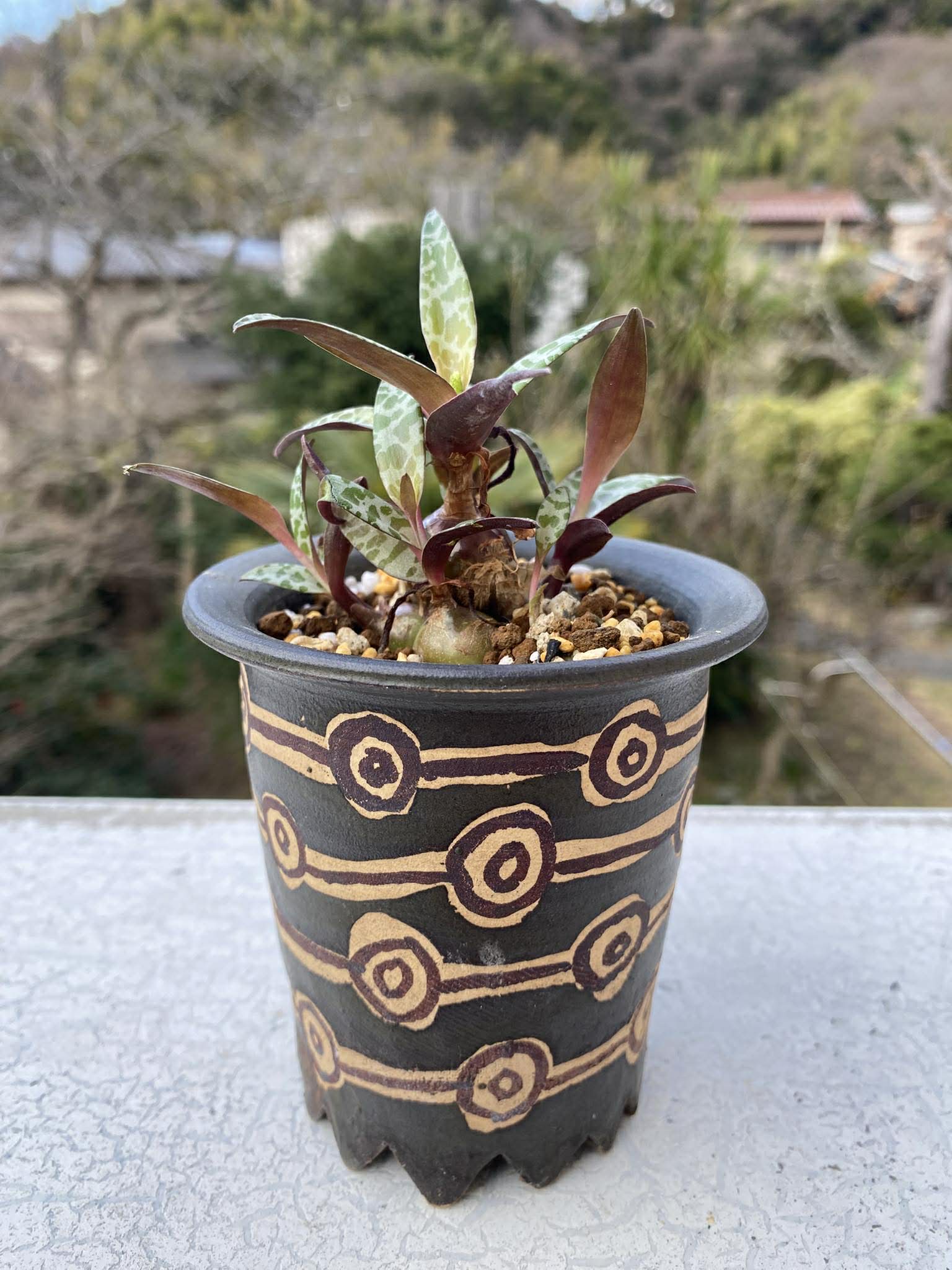 ツヤツヤな球根と綺麗な模様の葉っぱ。これもどこまで増えるか楽しみです。